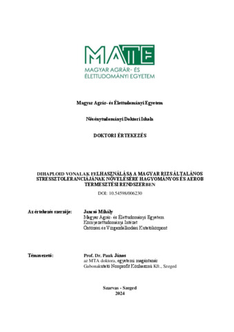 Jancsó, Mihály (2025) Dihaploid vonalak felhasználása a magyar rizs általános stressztoleranciájának növelésére hagyományos és aerob termesztési rendszerekben. PhD thesis, Magyar Agrár- és Élettudományi Egyetem. DOI: 10.54598/006230.